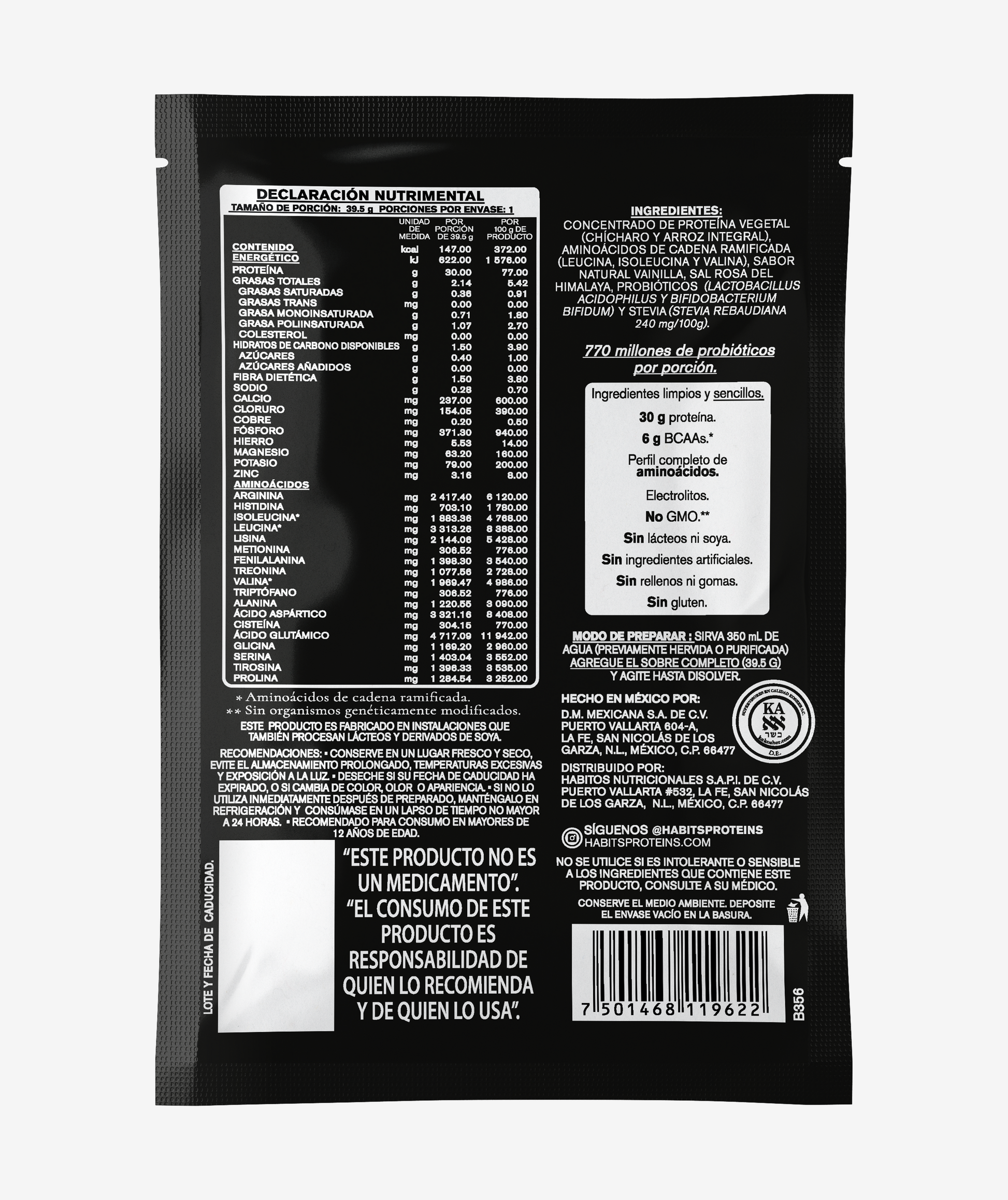 Cada sachet contiene 38.5 gramos, ideal para servir una porción. Podrás llevarlo a donde desees sin ocupar mucho espacio. La caja contiene 15 sachets individuales.